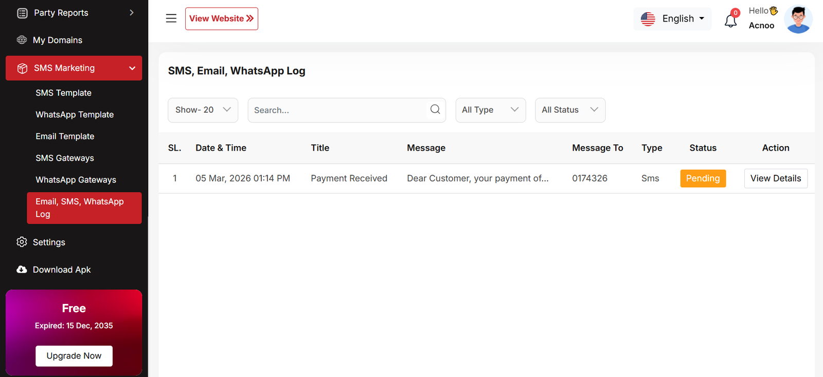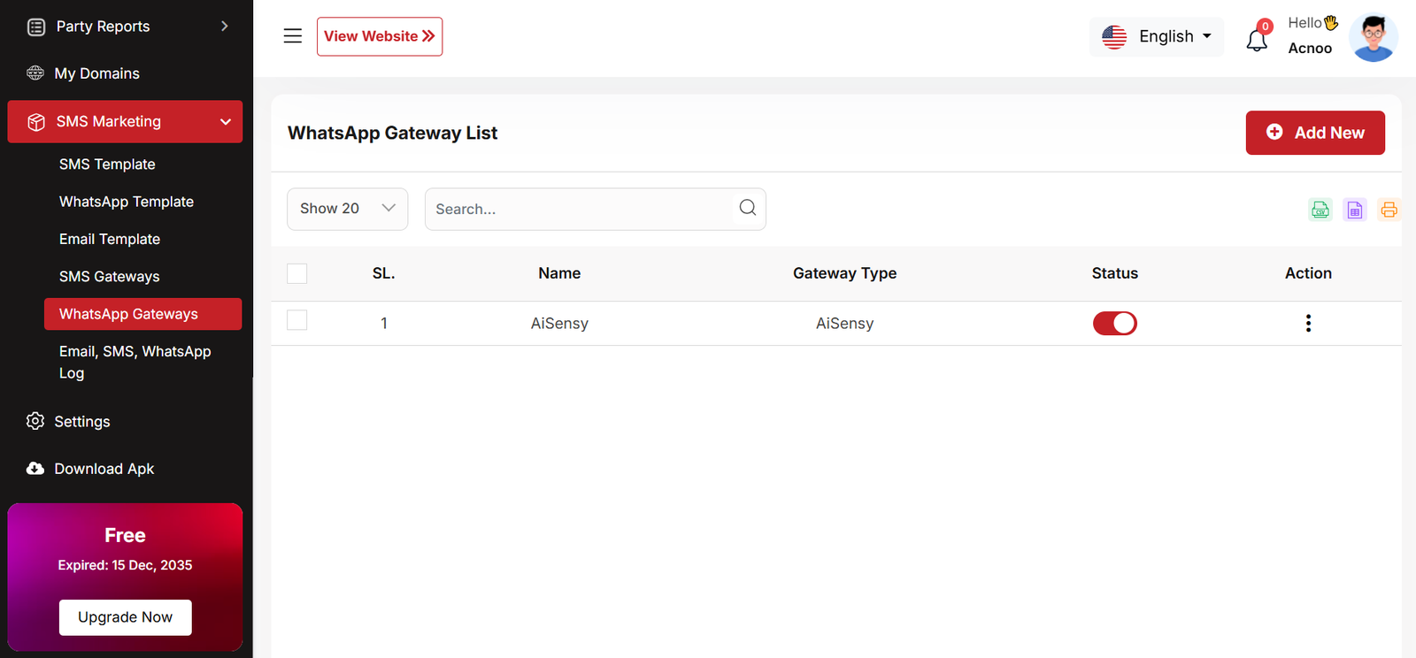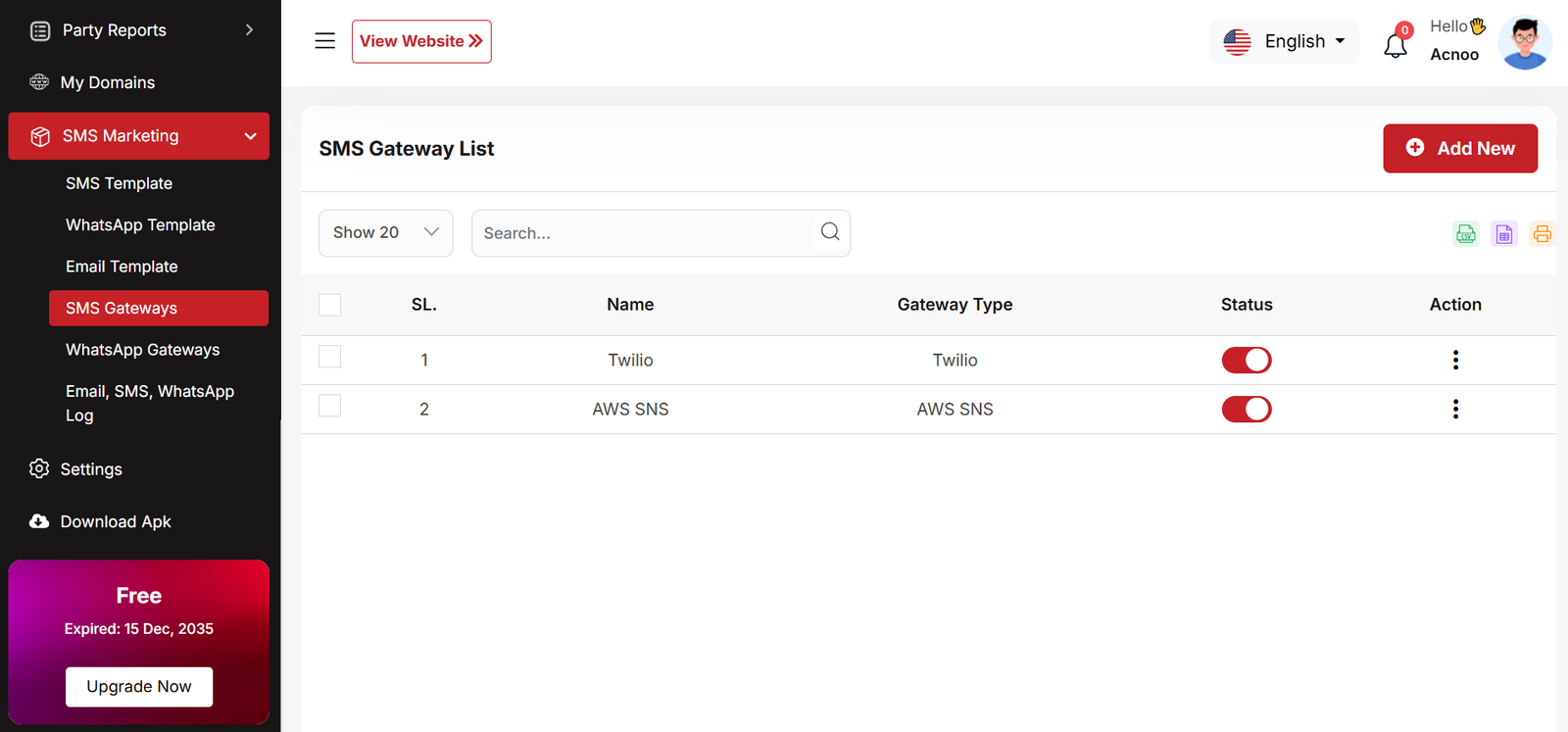 This is a screenshot of the domain list. Here you can see all the domains created by businesses. From this section, users can edit, delete, multi-delete, filter records using per_page, or search by name using the input field.